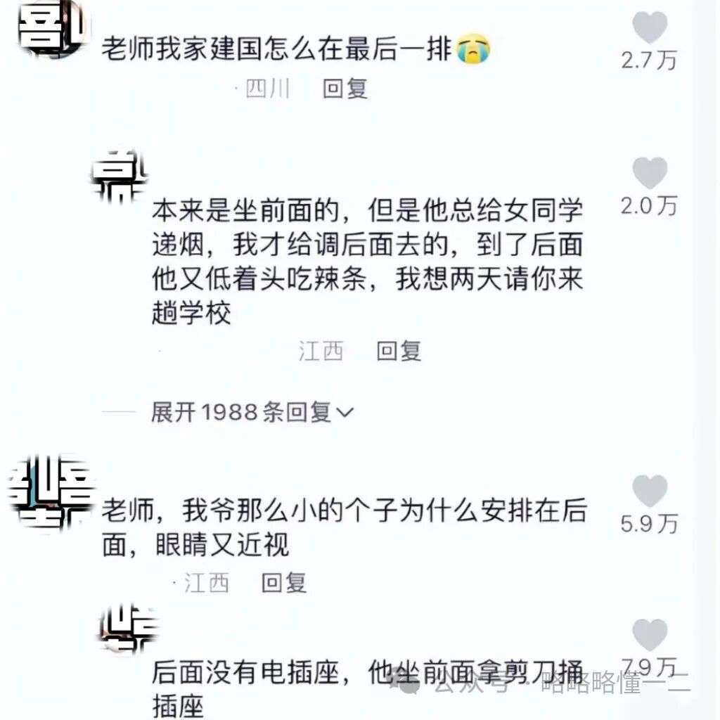 有“家崽”问他家建国为什么在最后一排了?老师说本来是坐前面的,但总给女同学递烟,调到后面又开始偷吃辣条,老师还想请网友来一趟学校。