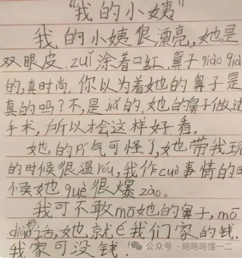但看了小学生写的作文后,大学生表示早知道这样,当初就不应该哄你,也不宣传点我正面的形象,说小姨的鼻子是做过手术的,有些话可不能说啊,这大概是小姨的秘密。