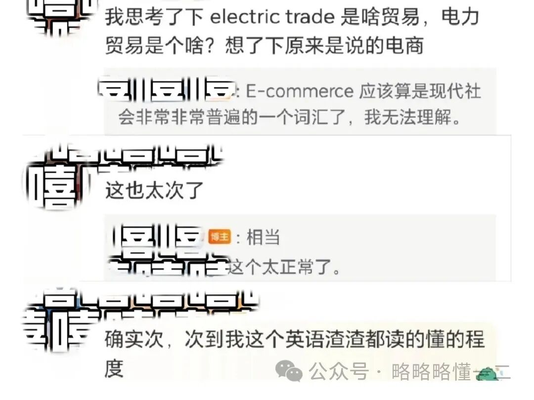 而且好多单词他好像没有掌握,他写的直译过来是“电力贸易”的英文应该是“E-commerce”,叫电子商务,在英语学习中还是很普遍的一个单词,尤其是近几年电商行业大火,这个词应该不陌生。