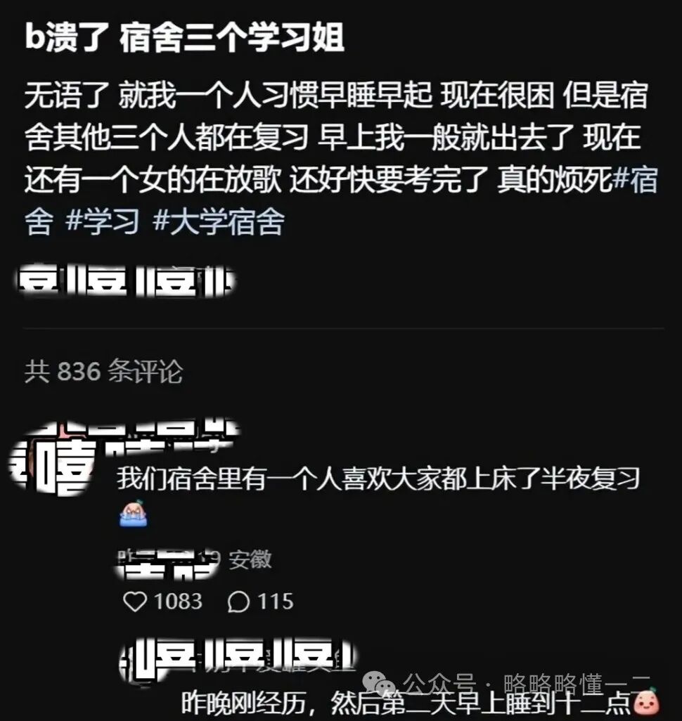 一名大学生在网上说全寝室就她一个人习惯早睡早起,已经很困了,但宿舍里其余三个人都在学习,还有一个室友在放歌。