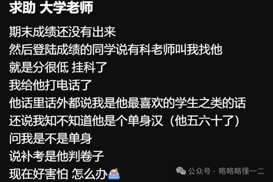 于是这名女大学生就给他打电话了,结果对方(年纪五六十岁的男老师)话里话外都说她是他最喜欢的学生之类的话,还问知不知道他是单身汉,女生是不是单身?