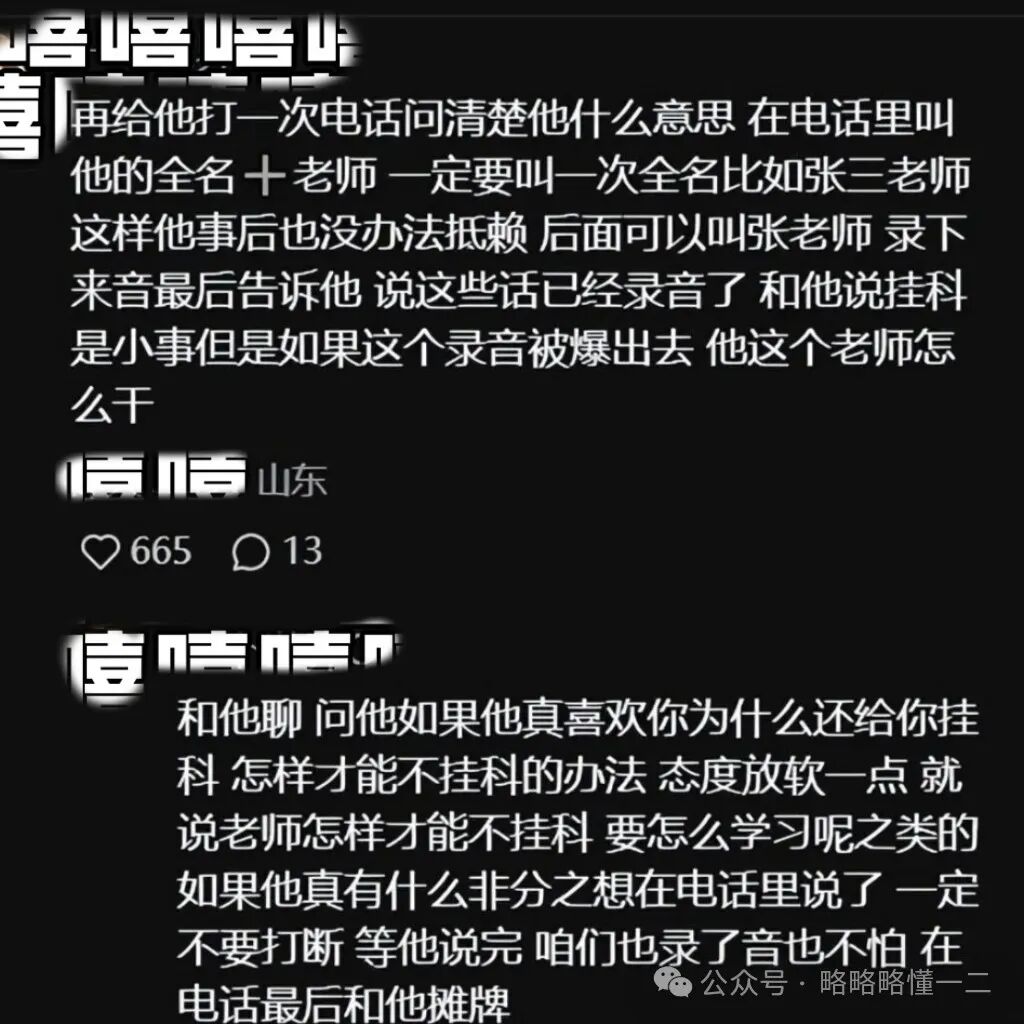 尤其是关于某位老师负面的一些新闻,大家可以在日常上课中或者是与老师交流中格外注意一下,观察老师的行为举动,看有没有怪异的行为举动,大家是能够感觉出来的,不要和老师走的太近,保持一定的距离,去刻意引起他的注意。