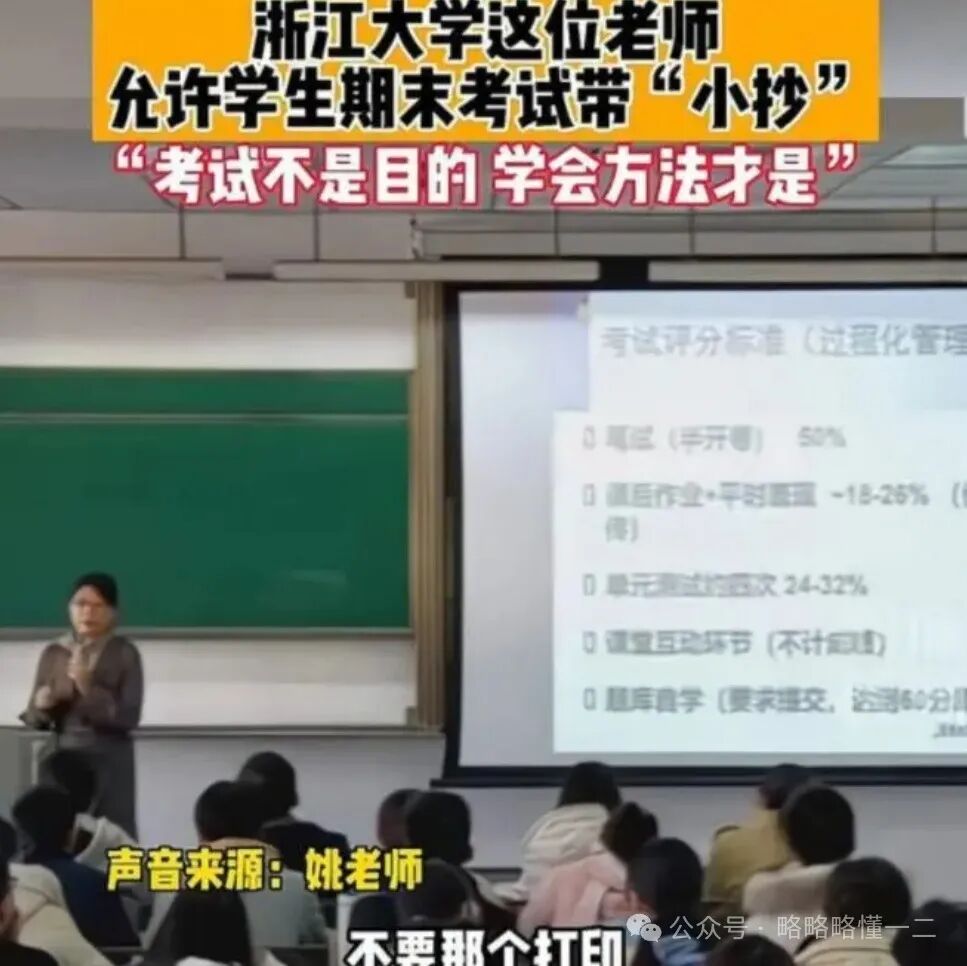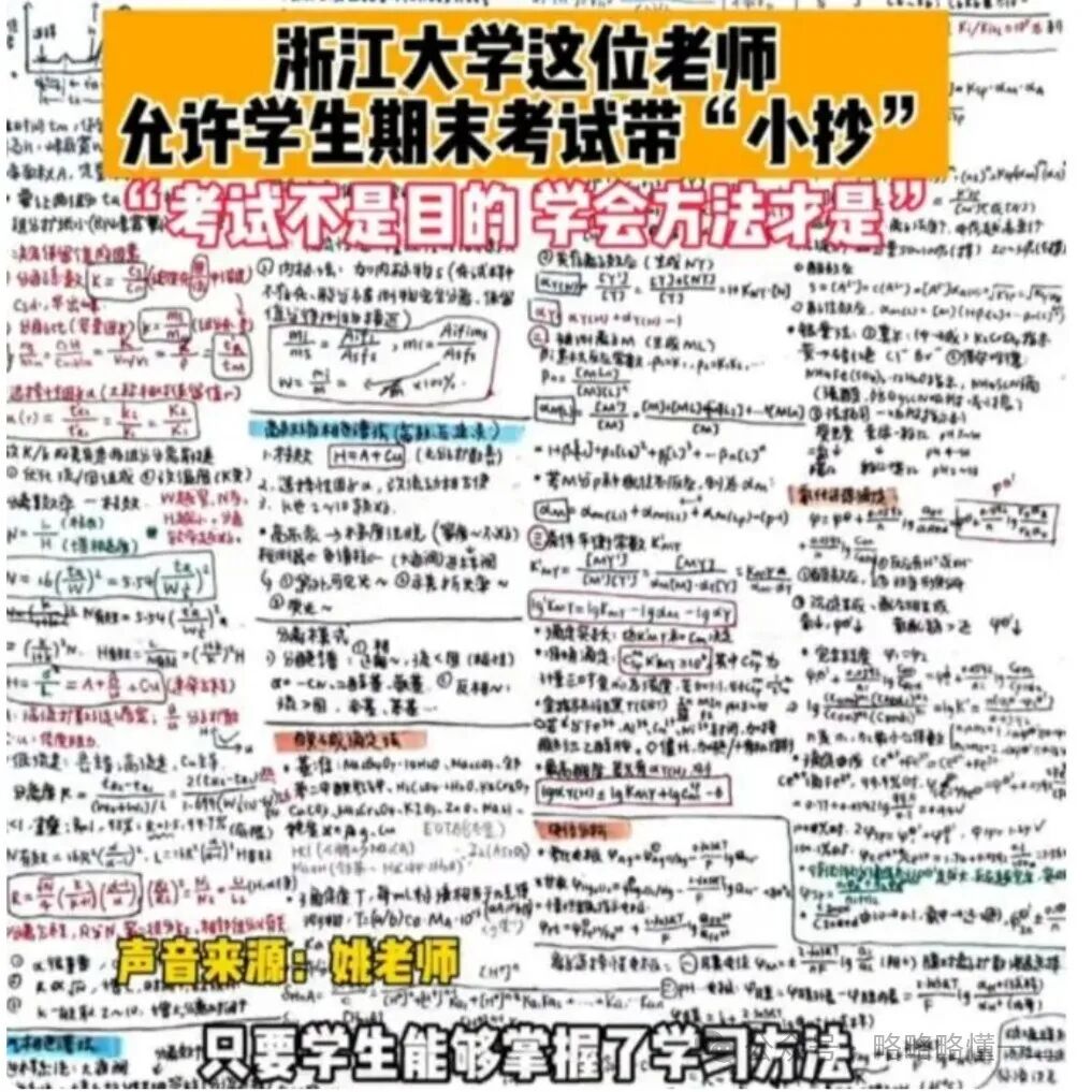浙大一位老师在期末考试的时候就允许学生带小抄,老师认为学习并不能是为了考试而考试,也不是以考试为目的,要学会学习方法。