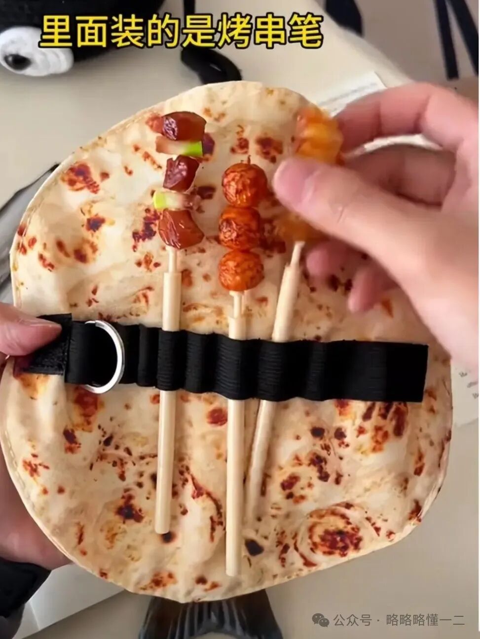 看着是一张卷饼,做的真的很逼真,实际上它充当着笔袋的作用,打开后里面有三个“烤串笔”,同样做的很逼真有趣,突然好想买一套,饿了的时候还能够看看,就当“望饼充饥”了。
