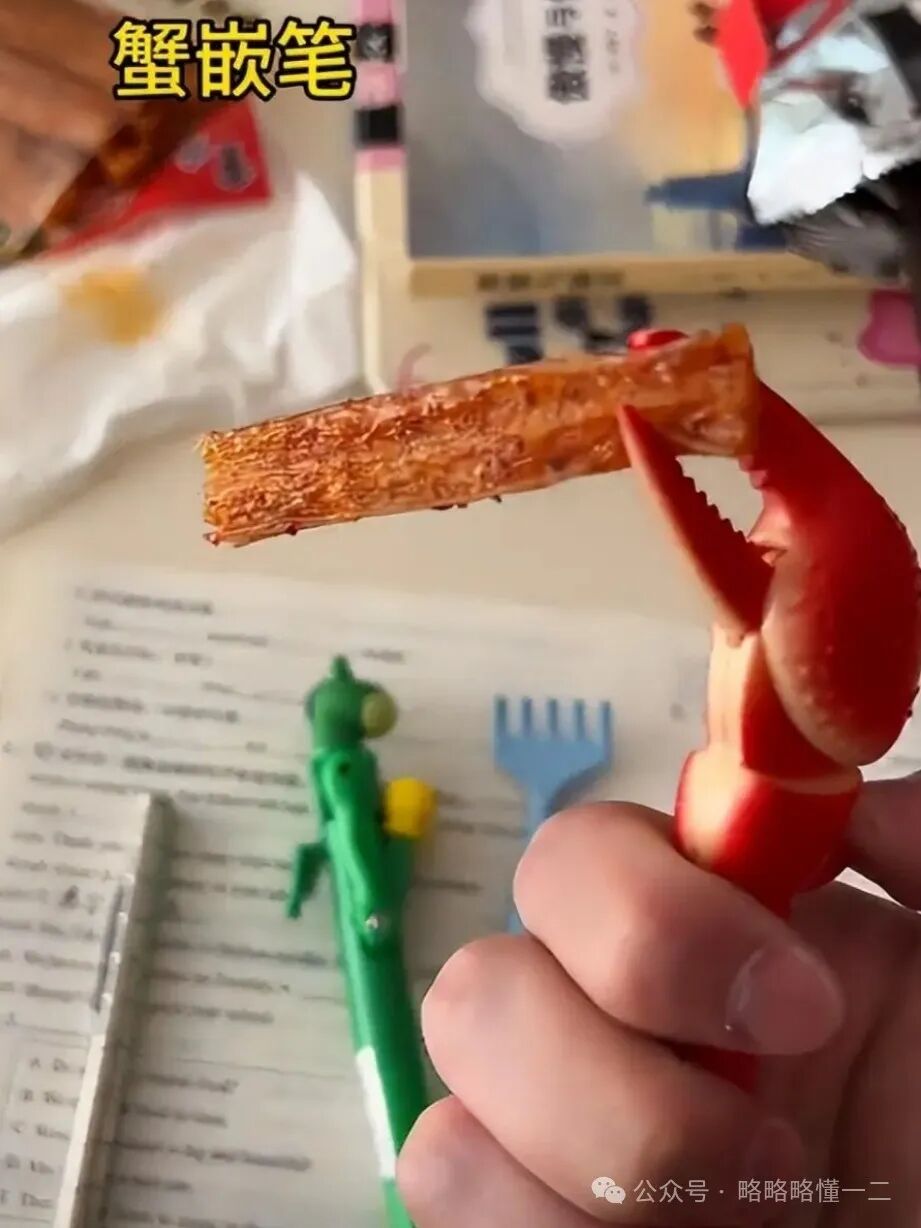 如果大家想吃同桌的辣条怎么办?虽然这个不提倡,就是和大家开个玩笑,但当你有了“蟹钳笔”后你就可以去夹同桌的辣条了,怎么样是不是很实用?