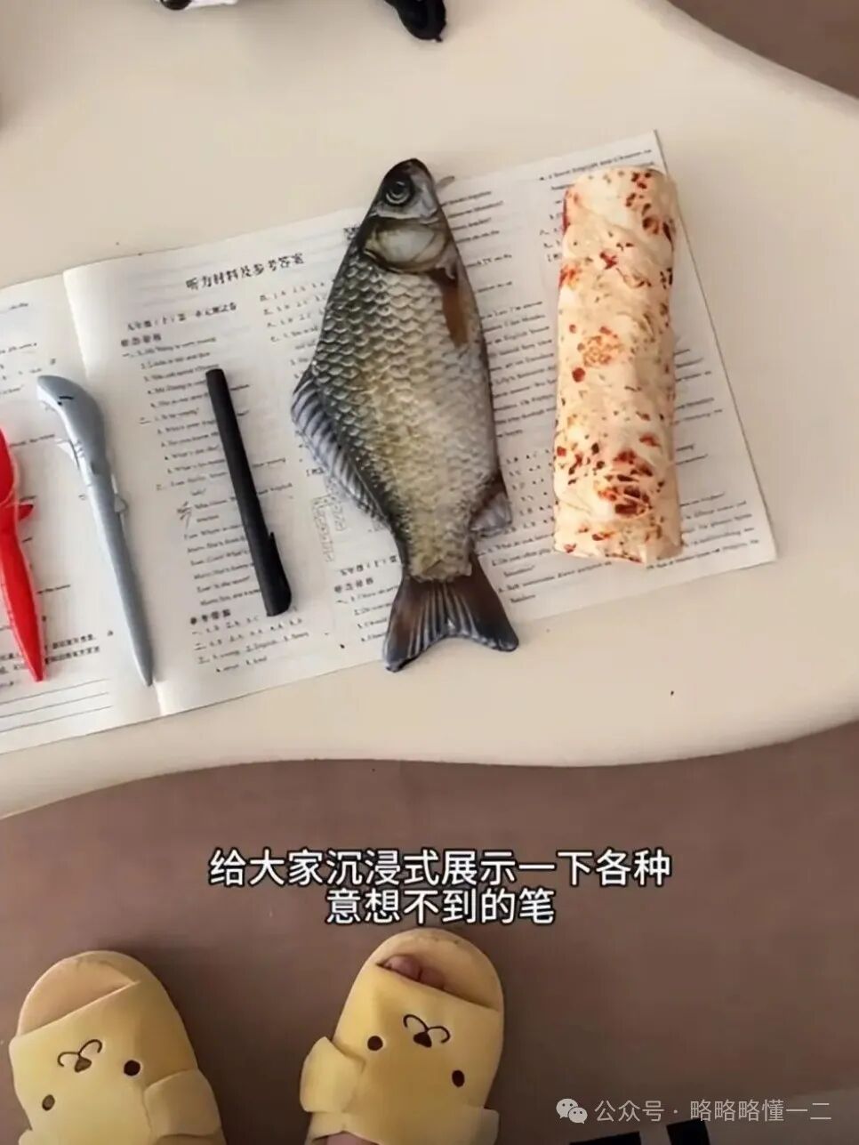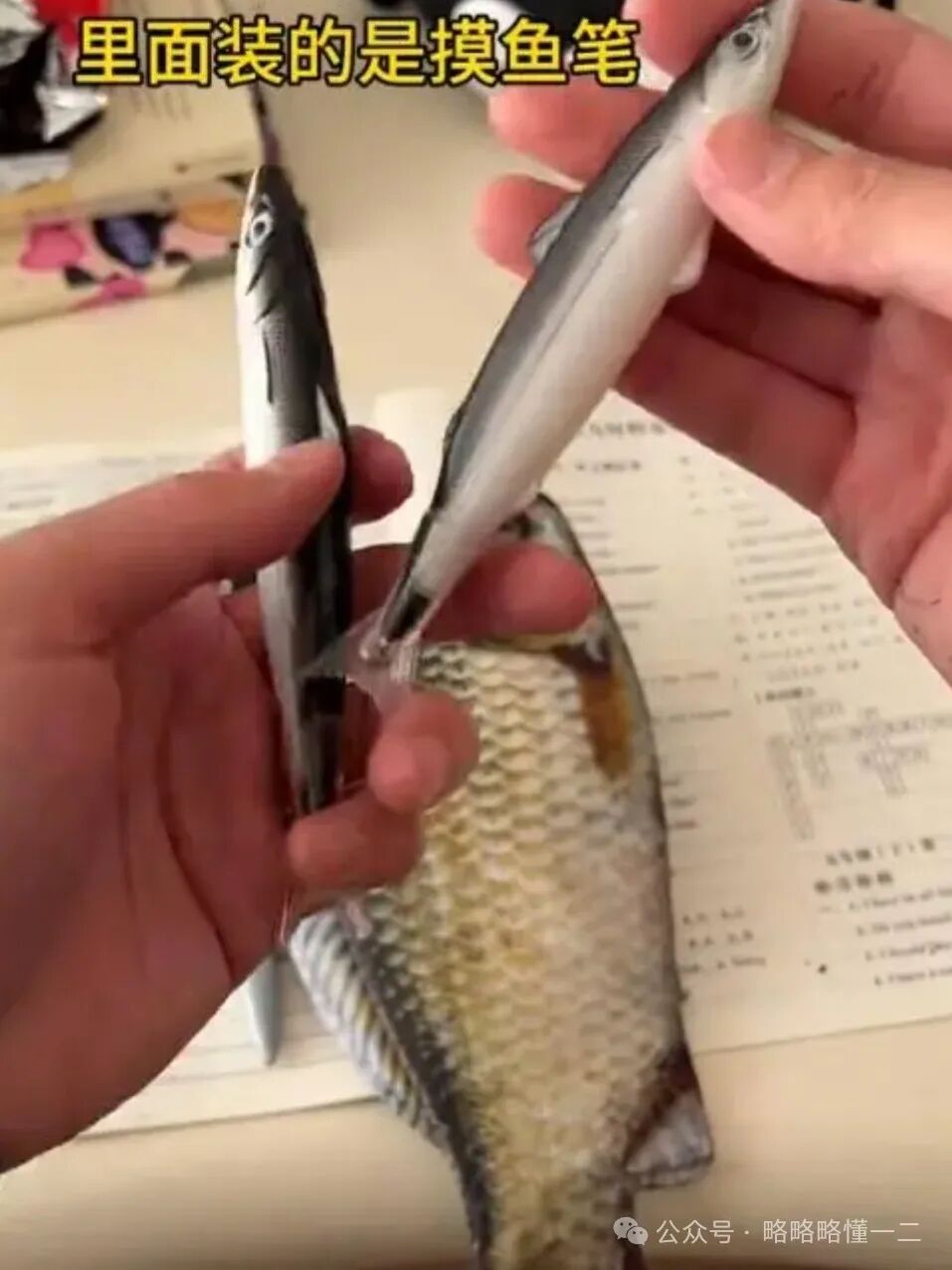 还有更让大家想不到的笔,如果说这条鱼是笔,大家指定不信。这么大的一只鱼怎么拿在手里写字呢?和那张“卷饼”一样,这条大鱼也是起到了笔袋的作用,里面装的是“摸鱼笔”。