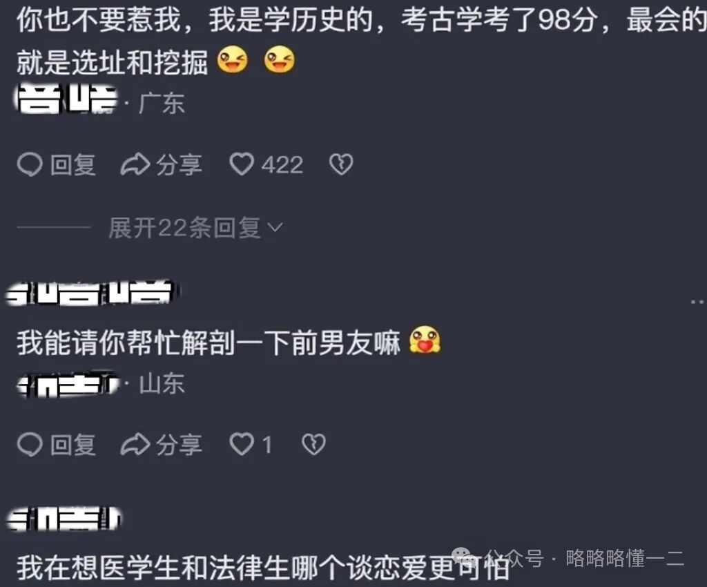 看到医学生在网上幽默提醒谈恋爱不要绿他外,其他专业的学生也开始“放狠话”,比如历史学的同学也说不要惹他,考古学98分,最会的是选址和挖掘。