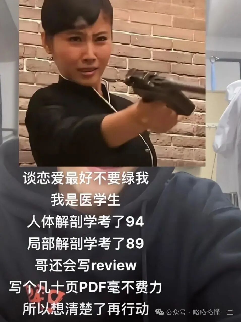 一名医学生在网上说:“谈恋爱最好不要绿我,我人体解剖学考了94分,局部解剖学考了89分,还会写报告,写上几十页PDF毫不费力,所以想清楚了再行动!”