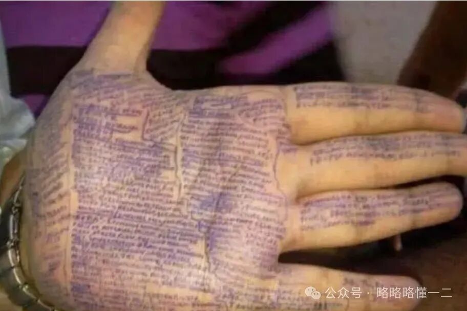 略略当年上学的时候,老师就发现了有同学把小抄写在了手上,结果当场让老师叫去把手洗了,只能恋恋不舍地把手洗了。