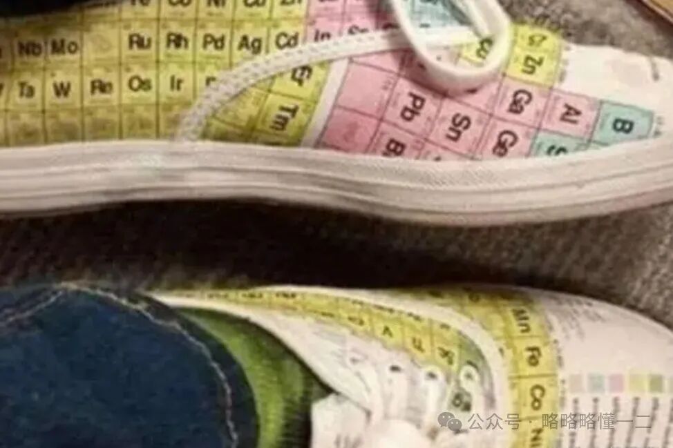 现在的衣服、鞋上面也有很多和知识相关的,比如带有英文的衣服,最离谱的是现在有了带化学元素周期表的鞋,学生心想:这鞋真是天助我也!