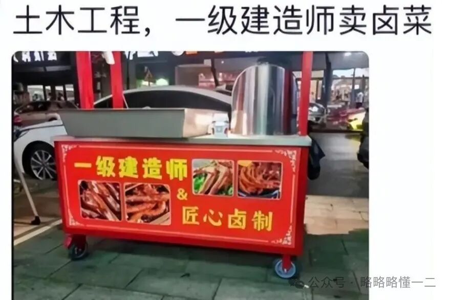 土木工程一级建造师在卖卤菜,还把自己的身份写在了餐车上,说明这名同学勇敢又自信。
