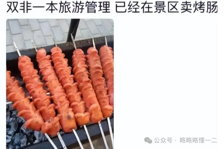 有旅游管理专业的学生在景区卖烤肠,虽然是卖烤肠,但已经是这些同学当中“跨专业就业”最不明显的了。