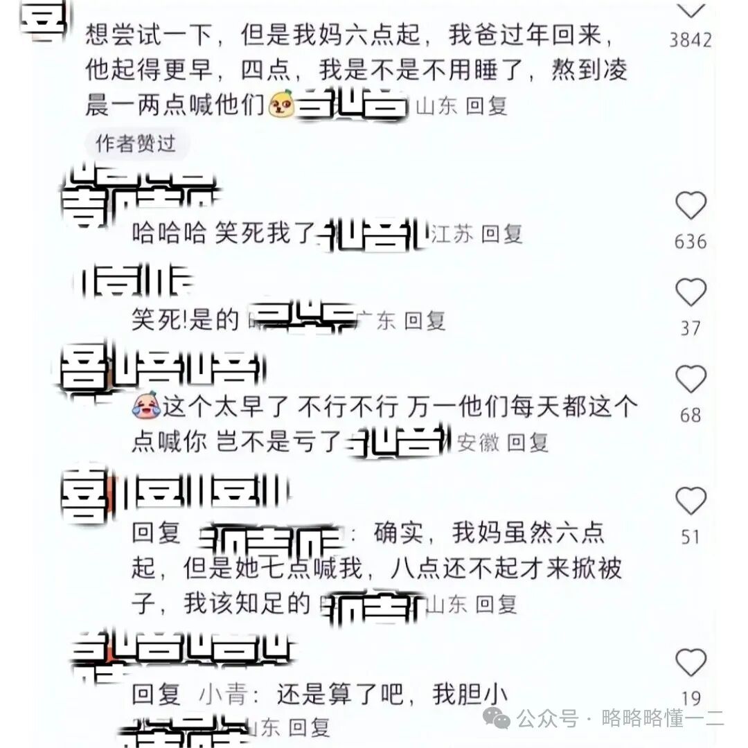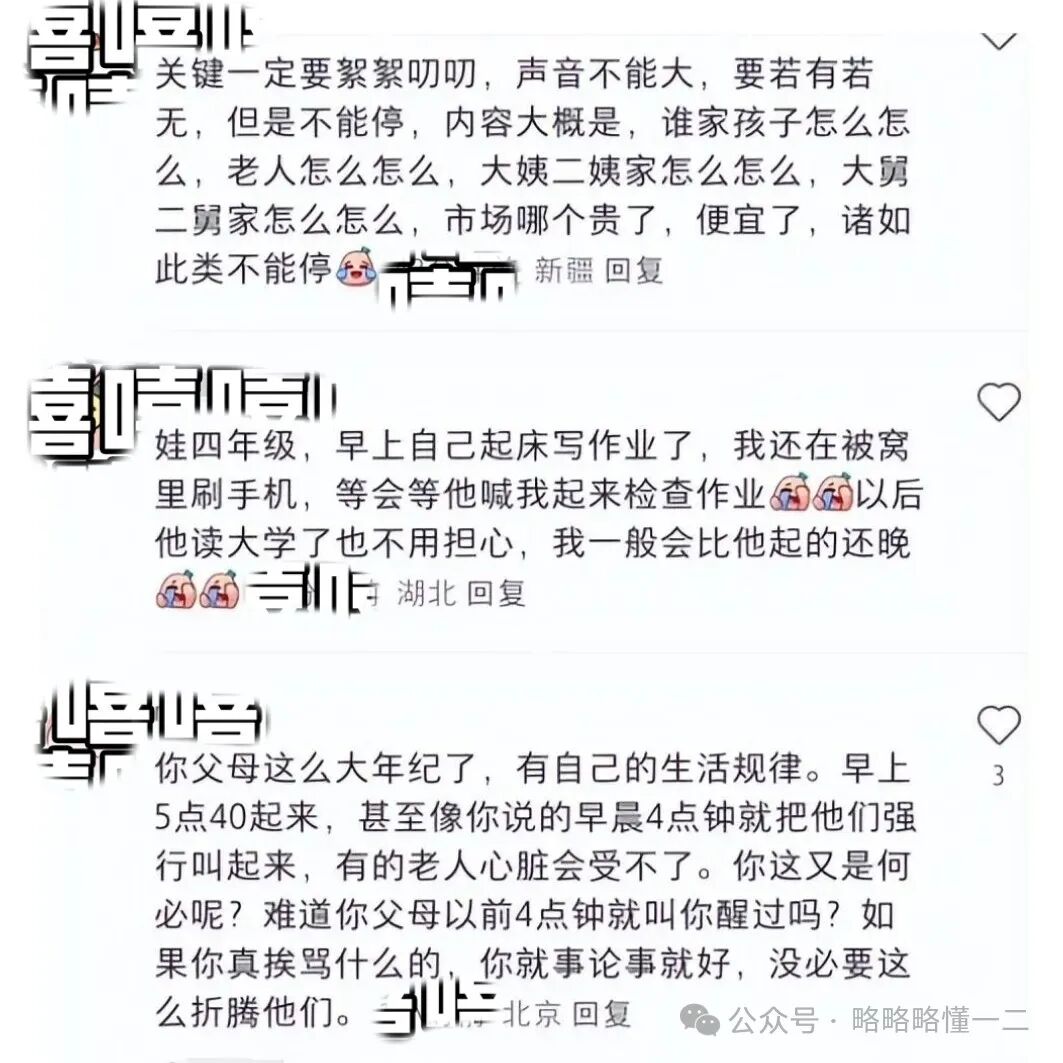 就像这名网友说的,父母都有自己的生活规律,这么早叫父母起床,父母的心脏会受不了的,父母也没这么早叫过自己啊?要是真挨骂的话,可以就事论事,没必要折腾父母。