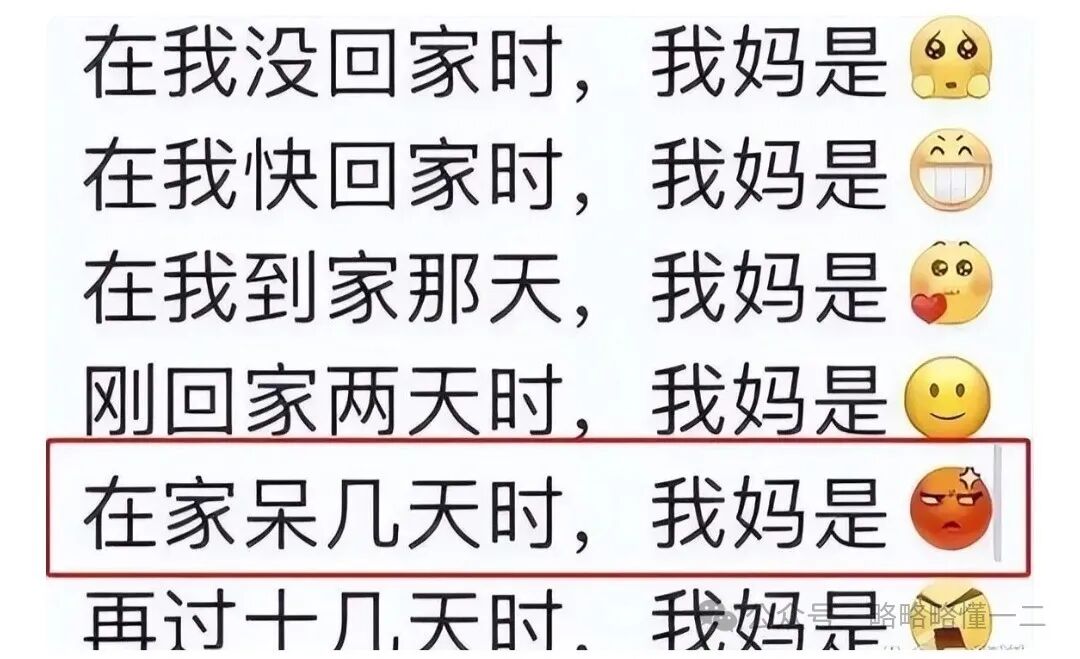 在家呆几天时,妈妈可能已经发过怒了,各种嫌弃挑剔大学生,大学生不是挨骂就是在挨骂的路上,再过十几天后,感觉妈妈要受不了了,一副巴不得孩子早点开学的样子。