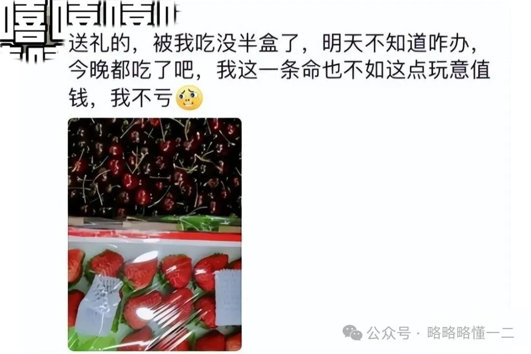 在过年这个时候的车厘子和草莓算是价格不菲的年货了,大学生晒图说是送礼的,结果被他吃没了半盒,还不知道明天怎么办呢?