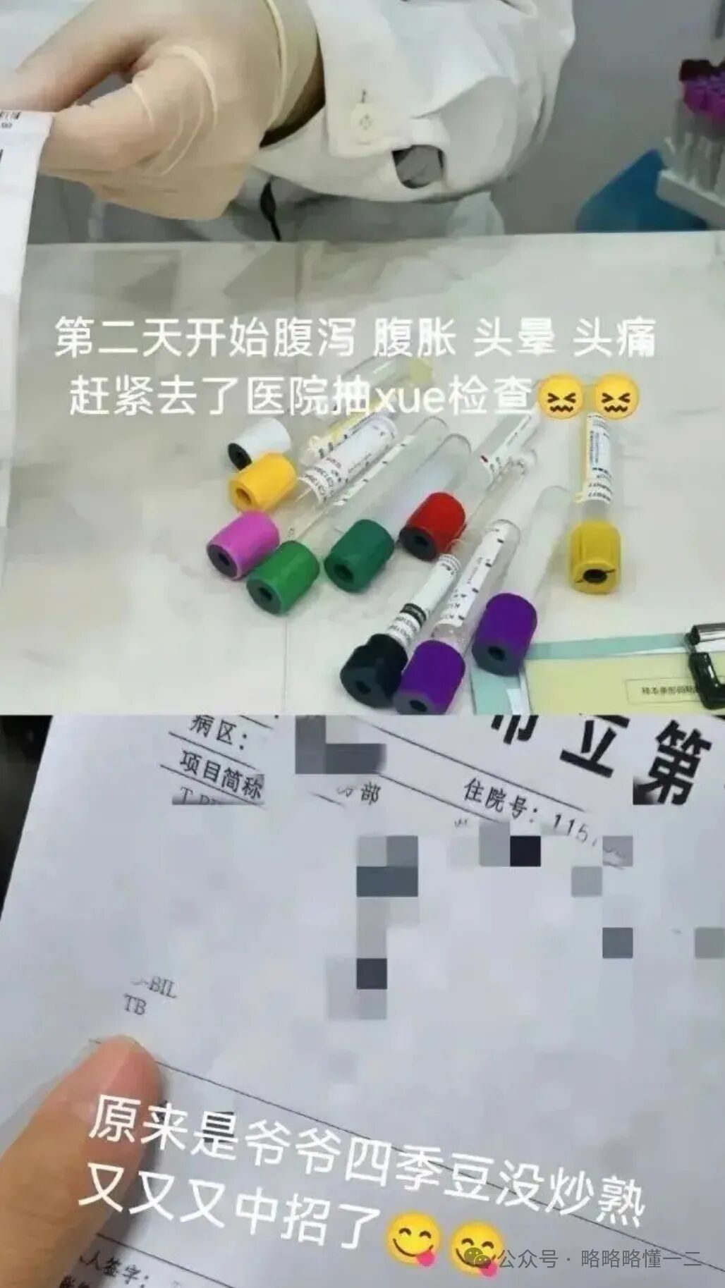 第二天开始腹胀腹痛又头晕,去医院检查后发现是爷爷做的清炒四季豆没有炒熟。