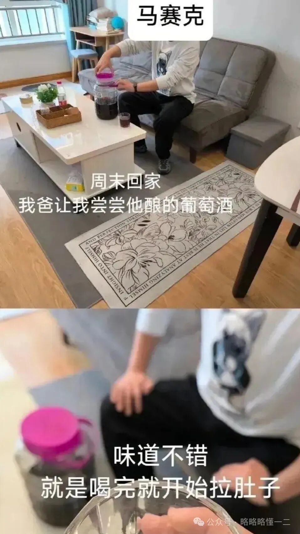 大学生一回家,爸爸就赶紧“亮货”,让孩子尝尝他自己酿的葡萄酒,大学生乖乖喝下,还评论了一番,觉得味道不错,就是喝完开始拉肚子。