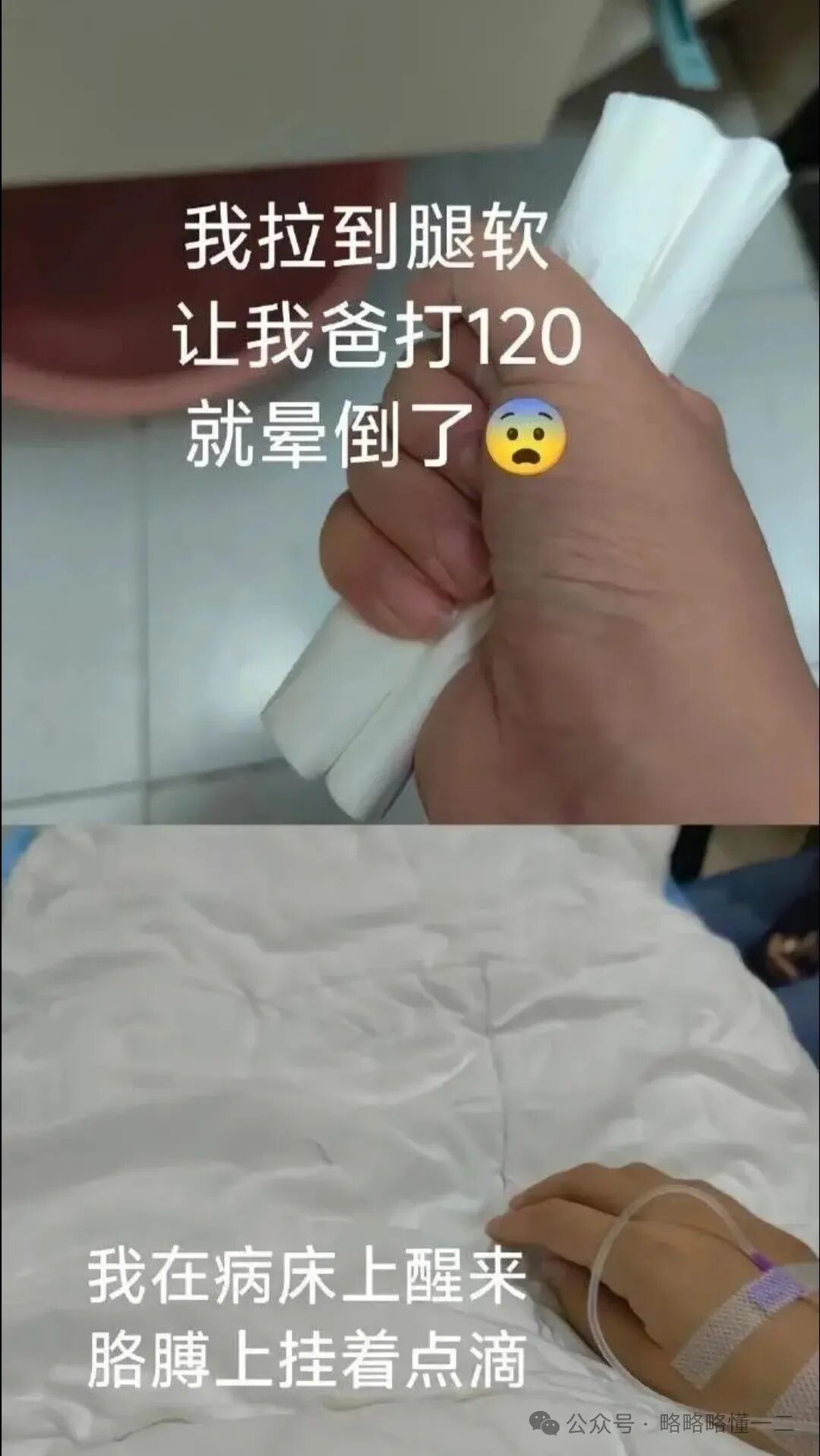 拉肚子太过于严重,拉肚子到腿软,让爸爸给打了120,然后自己晕倒了,再醒来的时候已经在病床上打着点滴。