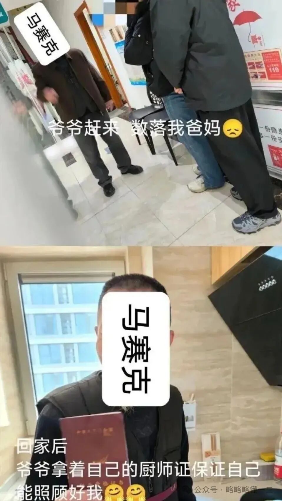 这时他的爷爷来了,数落爸爸妈妈为啥没有照顾好孩子,大学生放假回家就是全家的宝贝,这给老人心疼的,然后回家后爷爷拿着厨师证保证一定能照顾好孩子。