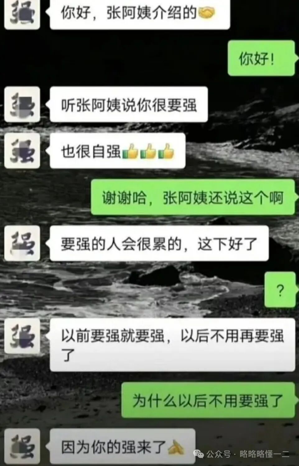 男生说听张阿姨说女生很要强,又说要强是很累的,以后就不用要强了,这话说的让人迷迷糊糊的,结果引出自己想说的话,“因为你的强来了”,真是土味情话听多都免疫了。