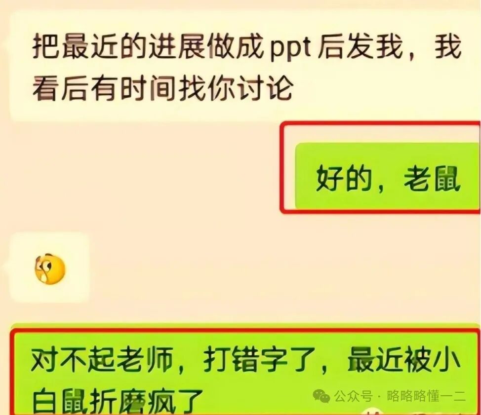 还有同学和导师聊天时打错字的,看起来非常尴尬,把“老师”两个字打成“老鼠”,给老师很是惊讶,后来他也给老师解释了,要被小白鼠折磨疯了。