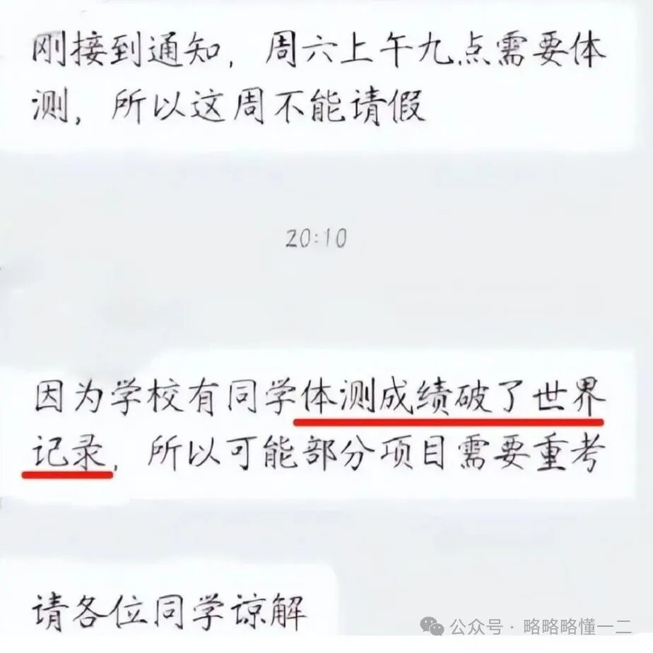 可即便是这样,同学们还是很大胆,在体测成绩上做了手脚。不得不说体育老师的情商是真的高,体育老师在群里通知体测重新考,因为有同学破了世界纪录。
