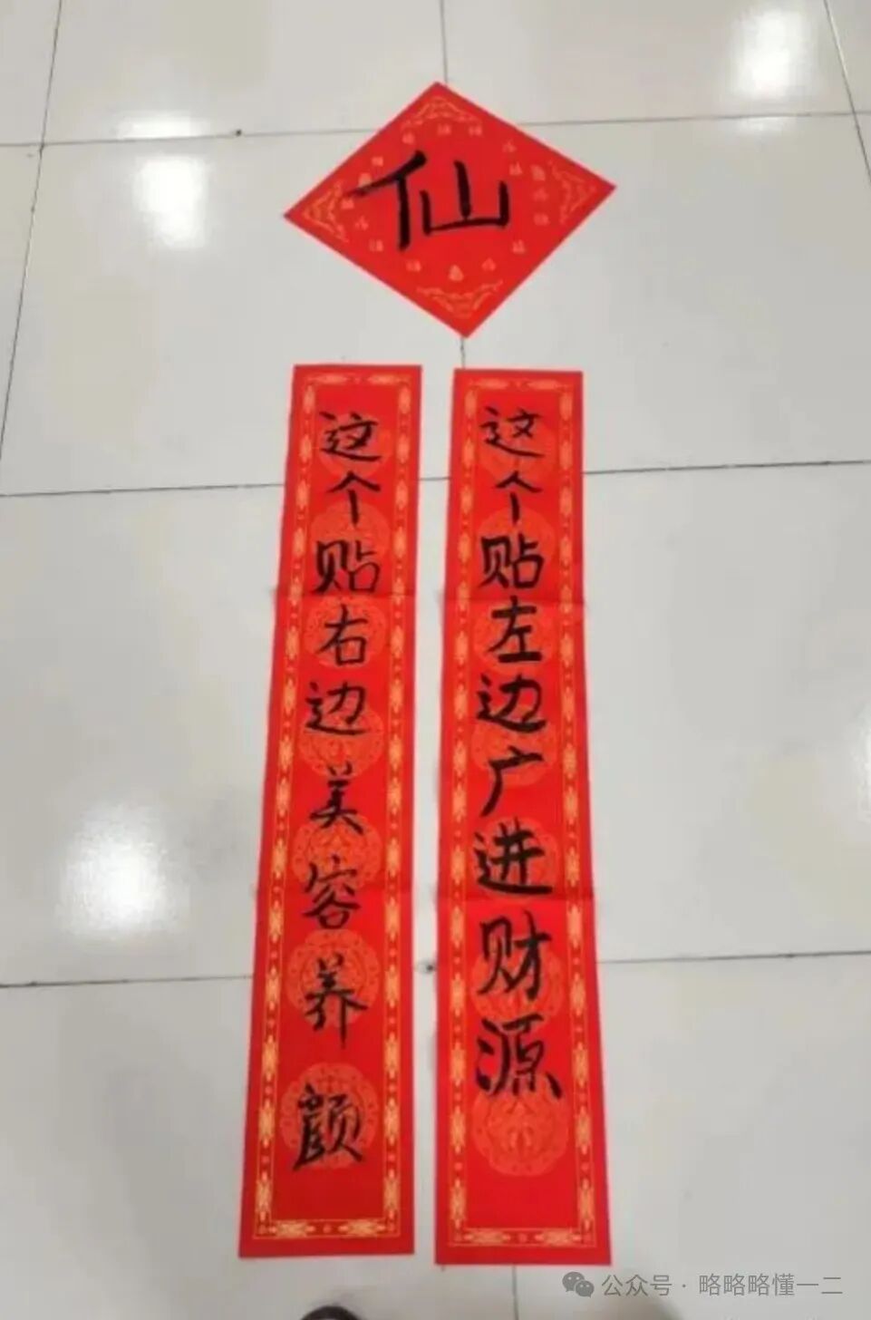 上联是“这个贴左边广进财源”,下联是“这个贴右边美容养颜”,还写了一个“仙”字。