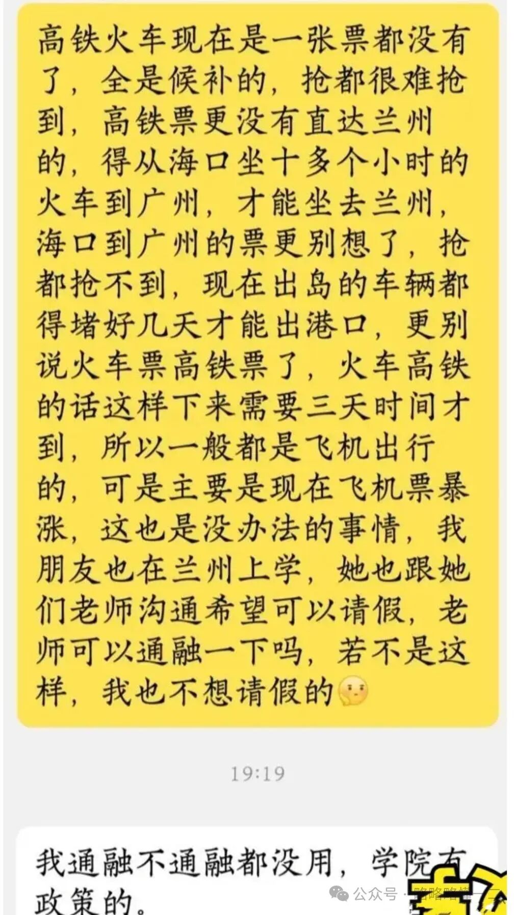 又说去的话需要从海口出发去广州,但也抢不到票,自己实在没办法了。大学生说自己的朋友也在兰州上大学,朋友也和他们的老师沟通想要请假,问老师是否可以通融?
