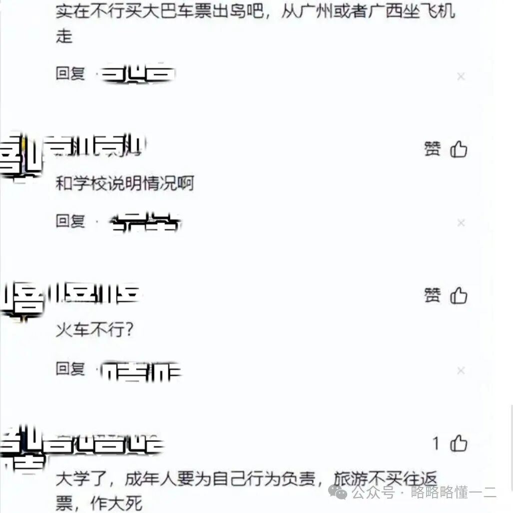 还有网友给他想办法,实在不行买大巴车票出岛,从广州或广西坐飞机走。总之办法总比困难多,可以尝试一下能不能中转到达。