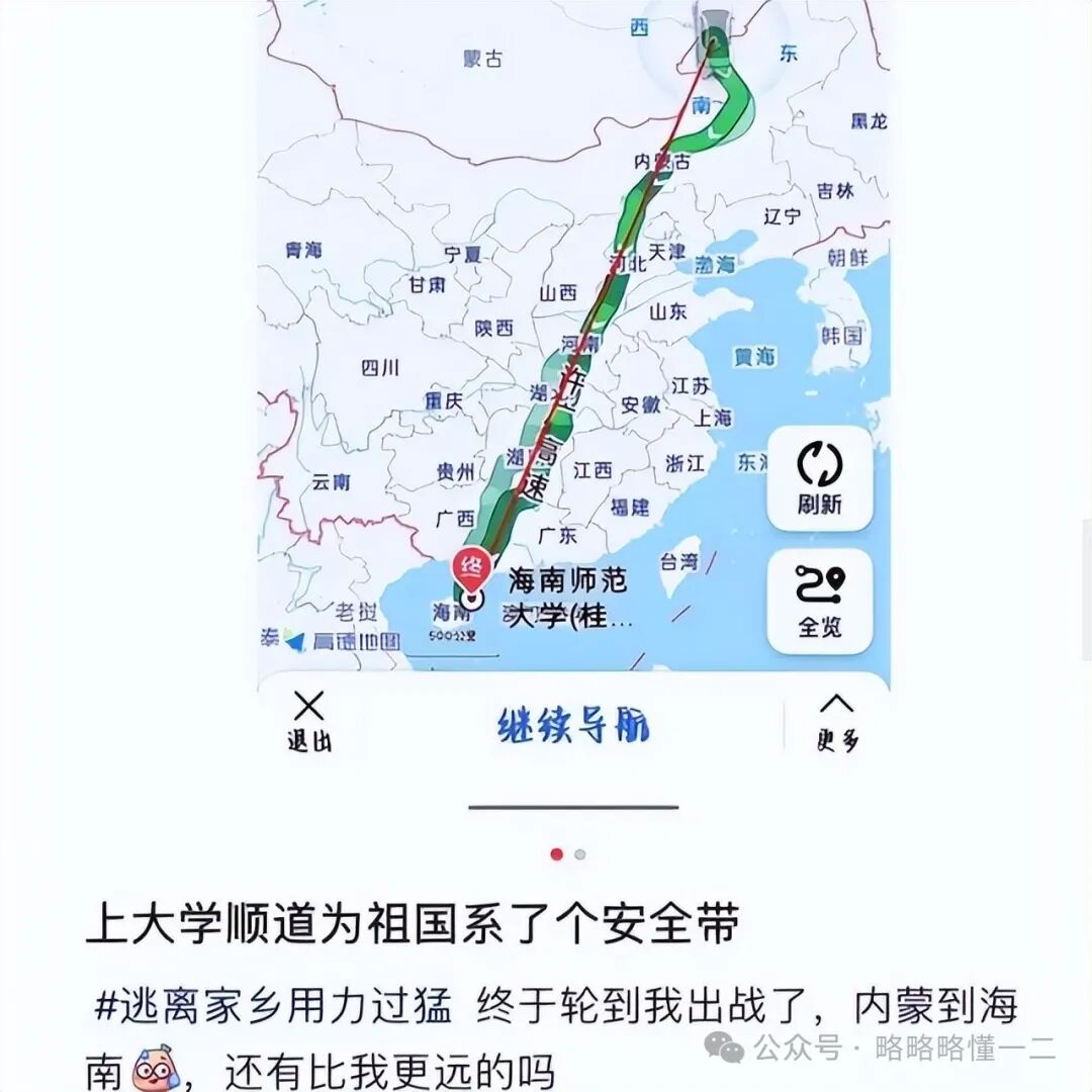 所以不少同学的大学是在省外读的,甚至有同学晒出了路线图,横跨半个中国上大学,网友开玩笑说这路线图好像是给中国系安全带。