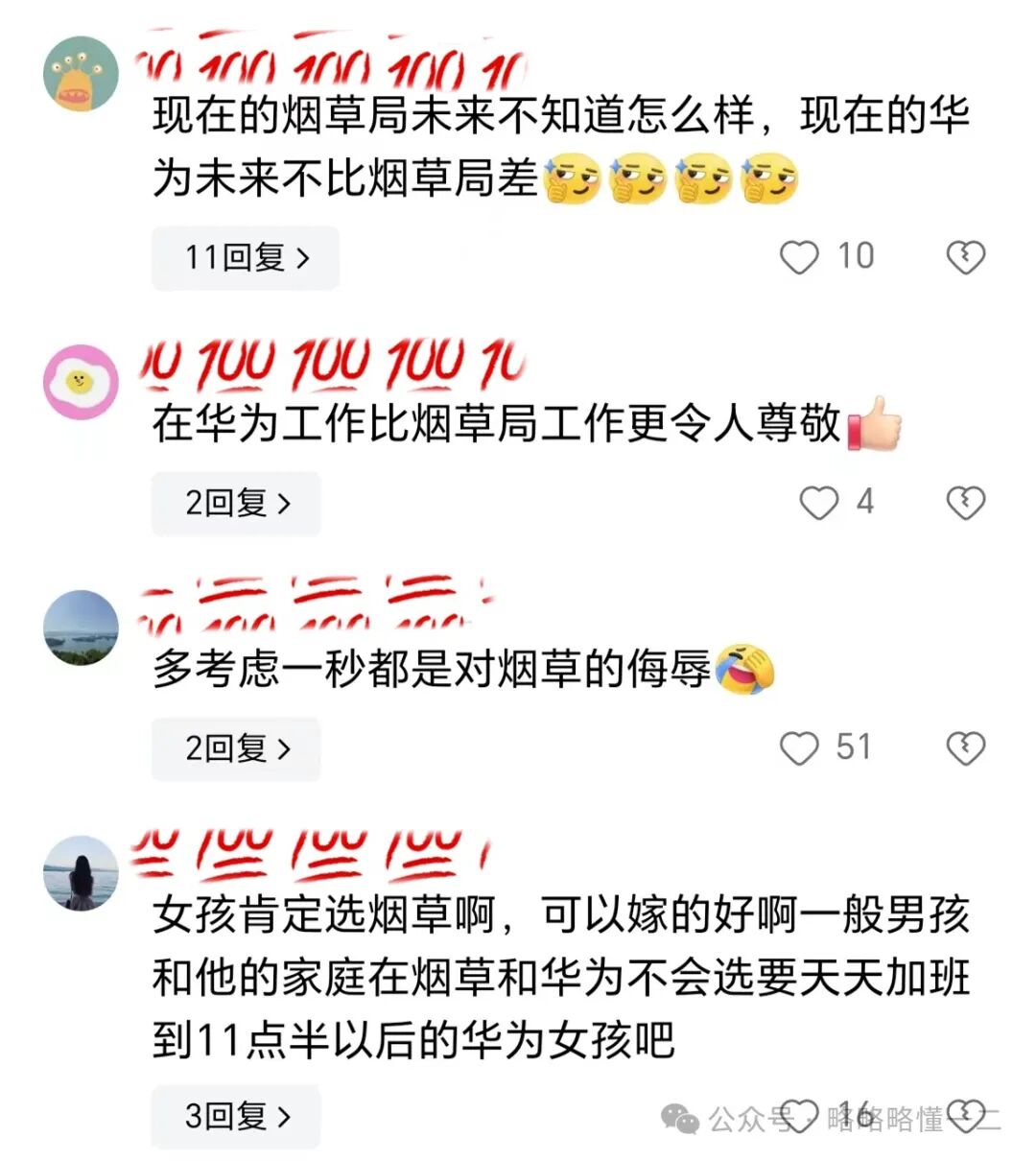 正如一名网友说的,在华为工作比烟草局更加受人尊敬。烟草局的未来不知道会怎样,但是华为的未来一定也不会差!