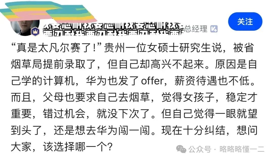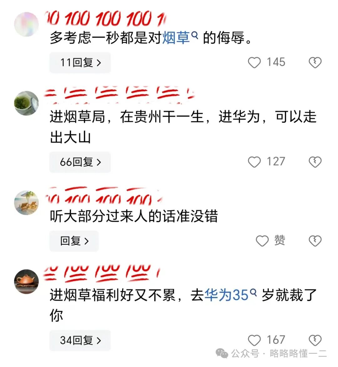 可惜,成年人的世界没有全都要。只不过反正是想想的话,在华为工作到35岁毕业,然后考进烟草局,是不是就是人生巅峰的赢家了!
