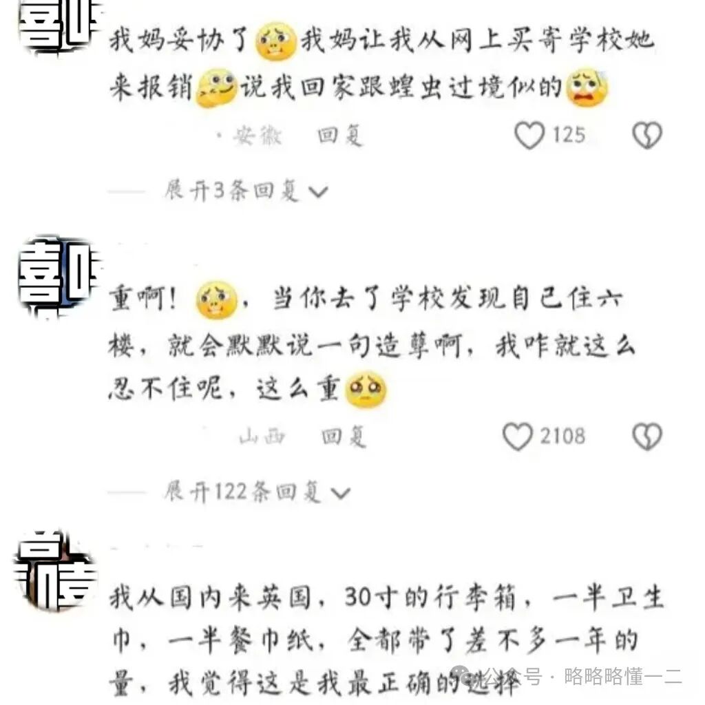 那大家的格局可能是没打开!因为评论当中有一名留学生,从国内去英国也带了很多生活用品,30寸的行李箱一半是卫生纸,一半是餐巾纸,全部都带了差不多一年的量。