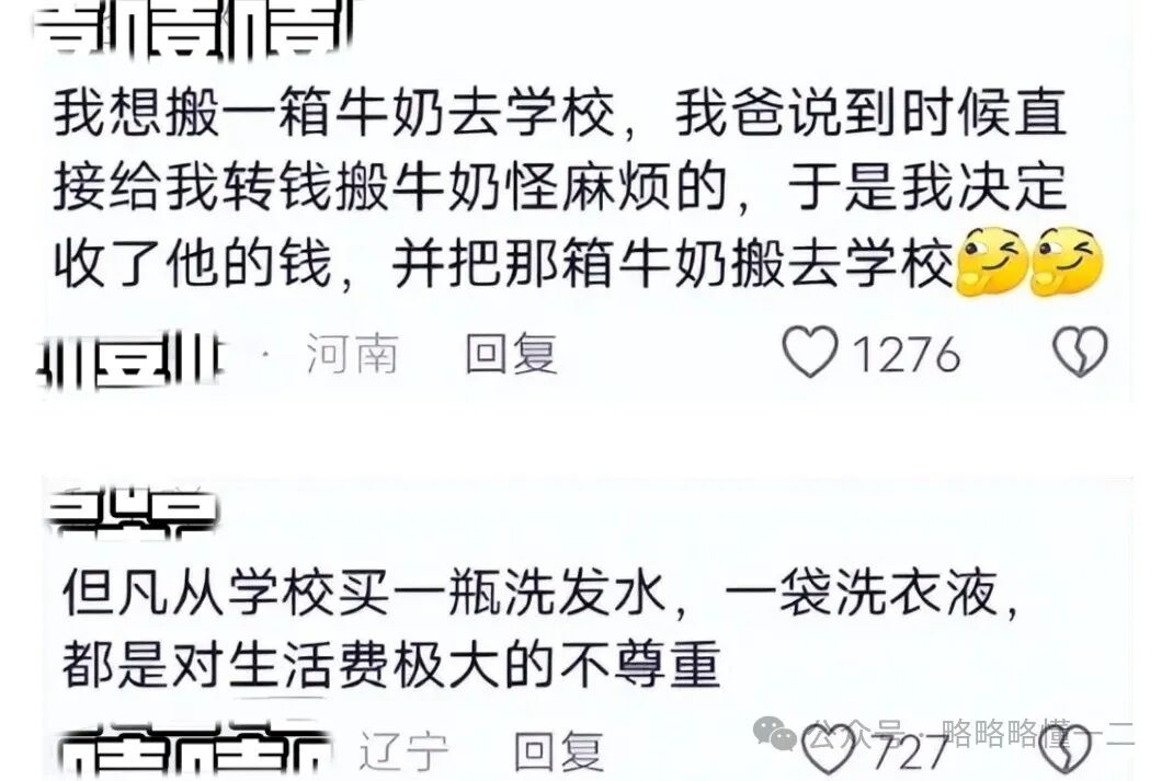 爸爸可能感觉哪里不太对。这名同学直言:“但凡从学校买一瓶洗发水,一袋洗衣液,都是对生活费极大的不尊重”,说的好像也有点道理。