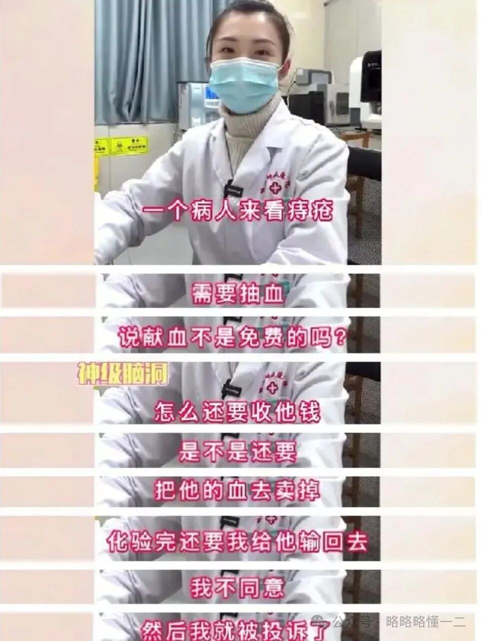 病人来医院看痔疮,需要抽血化验,结果病人不愿意了,说献血都是免费的,为啥抽他血要花钱,是不是要把他的血卖掉?
