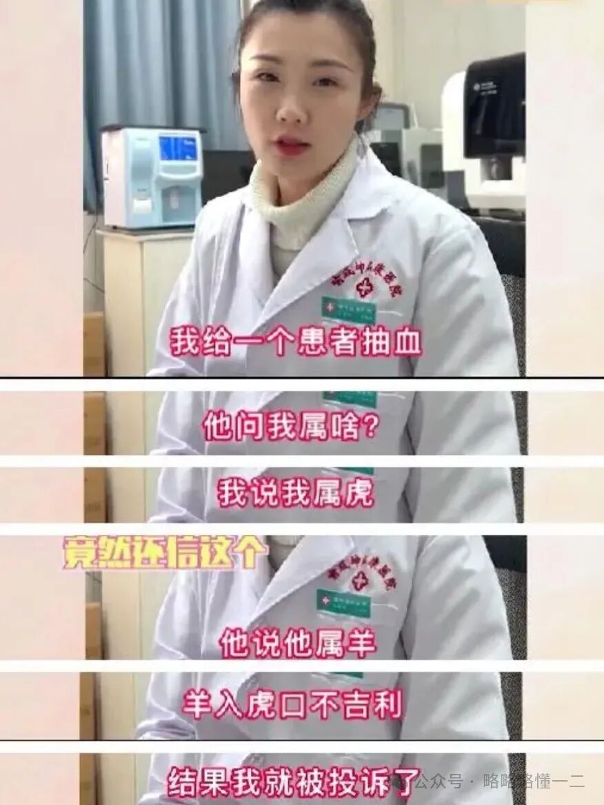患者问医生属什么,医生属虎,病人当场拒绝让她抽血,因为病人说自己属羊,然后“羊入虎口”不太吉利,居然还真有人信这个。