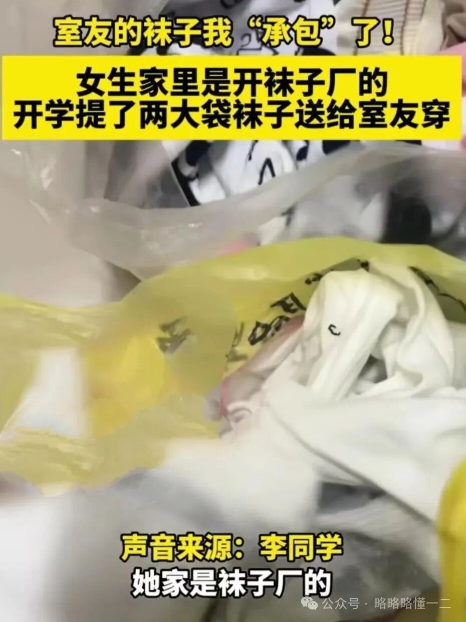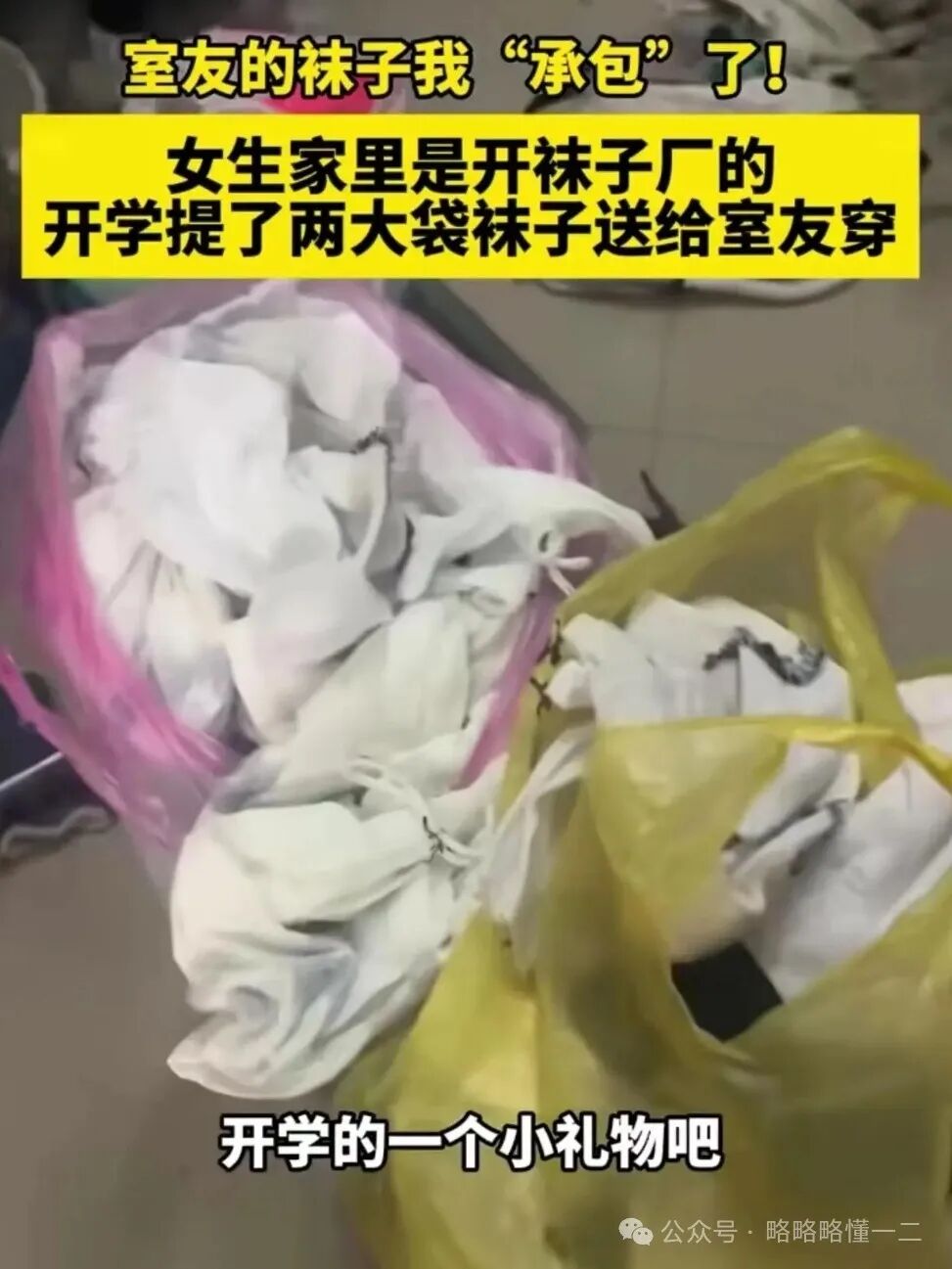 发布视频的女生曝光了原因,她说给带袜子的室友家是开袜子厂的,家里有很多很多的袜子,而且她每个学期在开学的时候都会给室友带袜子和土特产什么的。