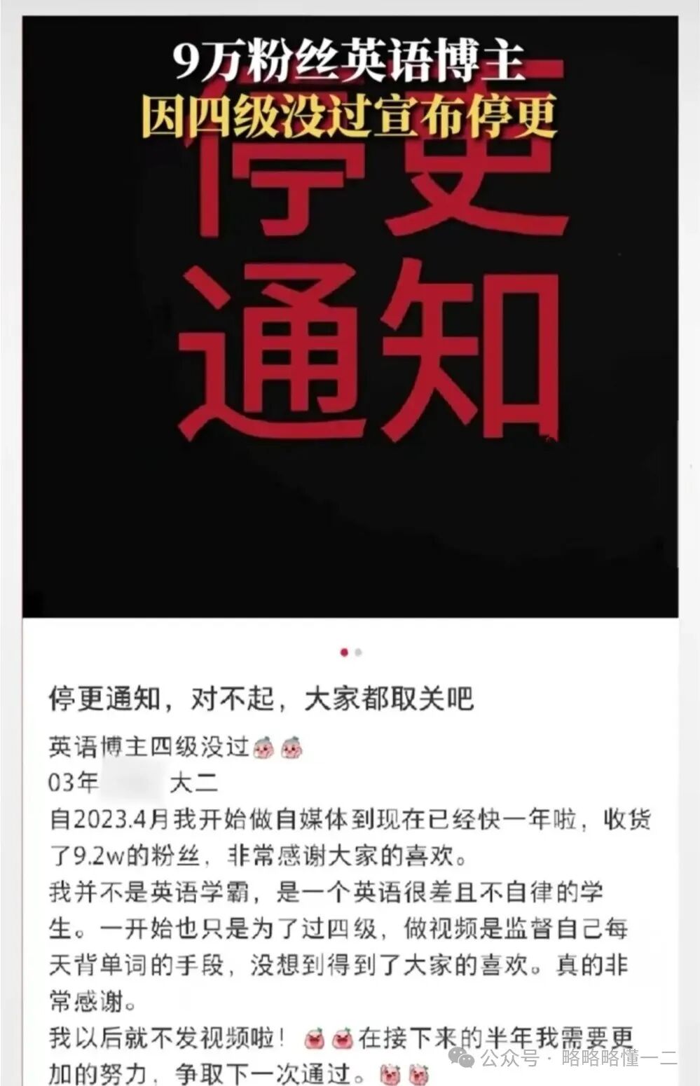 事情是这样的,这名英语博主在查到成绩后,在社交平台上发布动态,非常坦诚地说自己英语四级没过,大家都取关吧,然后宣布停更,还向大家道了歉。