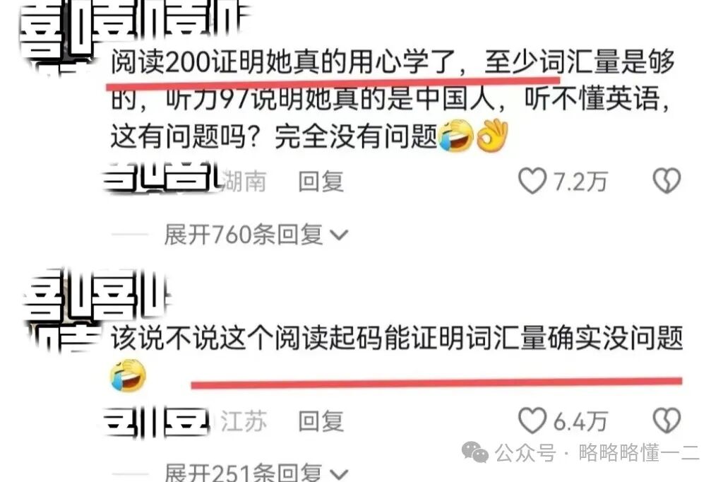 网友说阅读200分证明她真的认真学习了,至少词汇量是够的,听力97分说明是中国人,听不懂英语没什么。