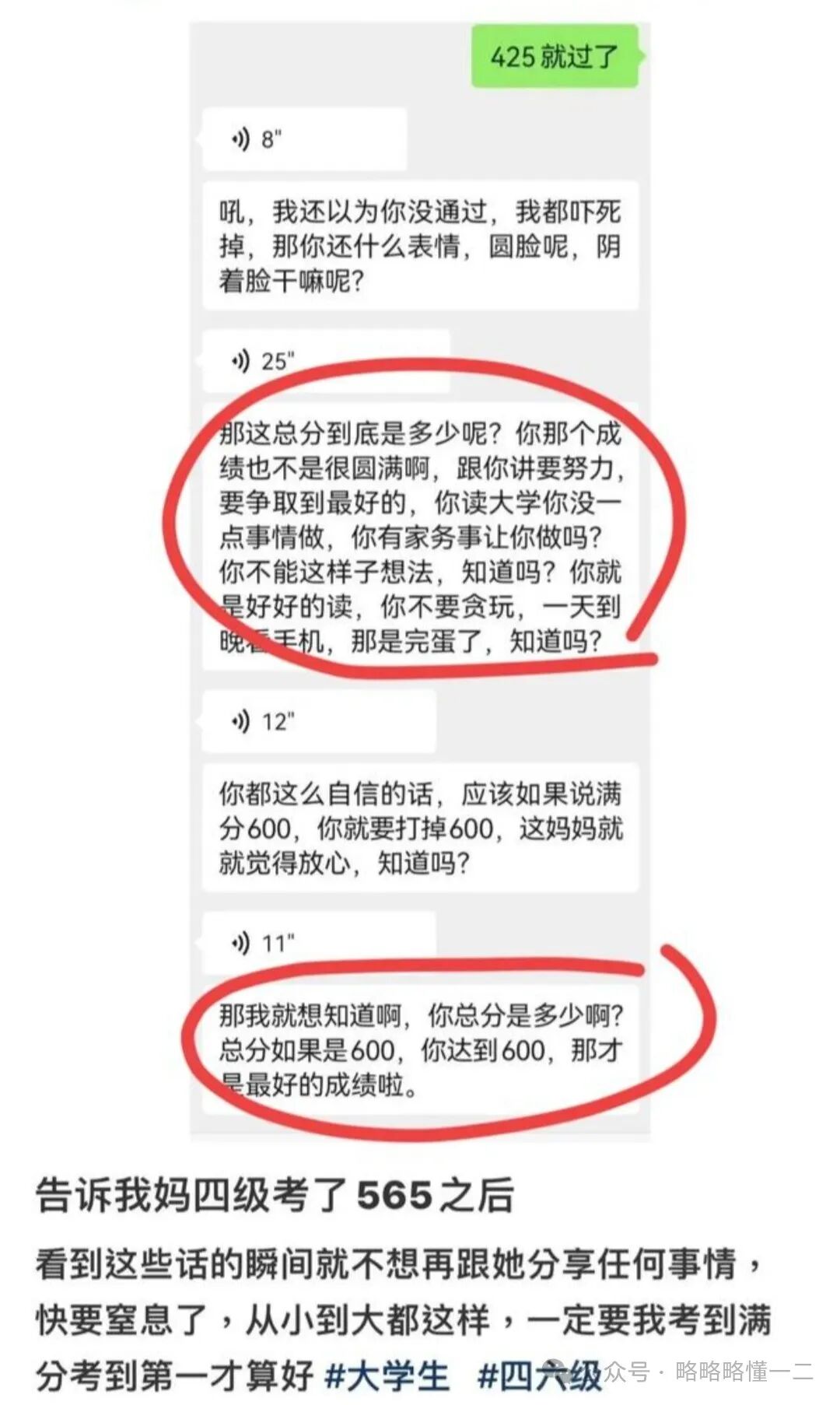 可妈妈真的知道英语四六级考试的难度吗?女生在网上说看到妈妈说的这些话后,瞬间不想跟他分享任何事情了,从小到大都是这样,快要窒息了,一定要考到满分或考第一才好。