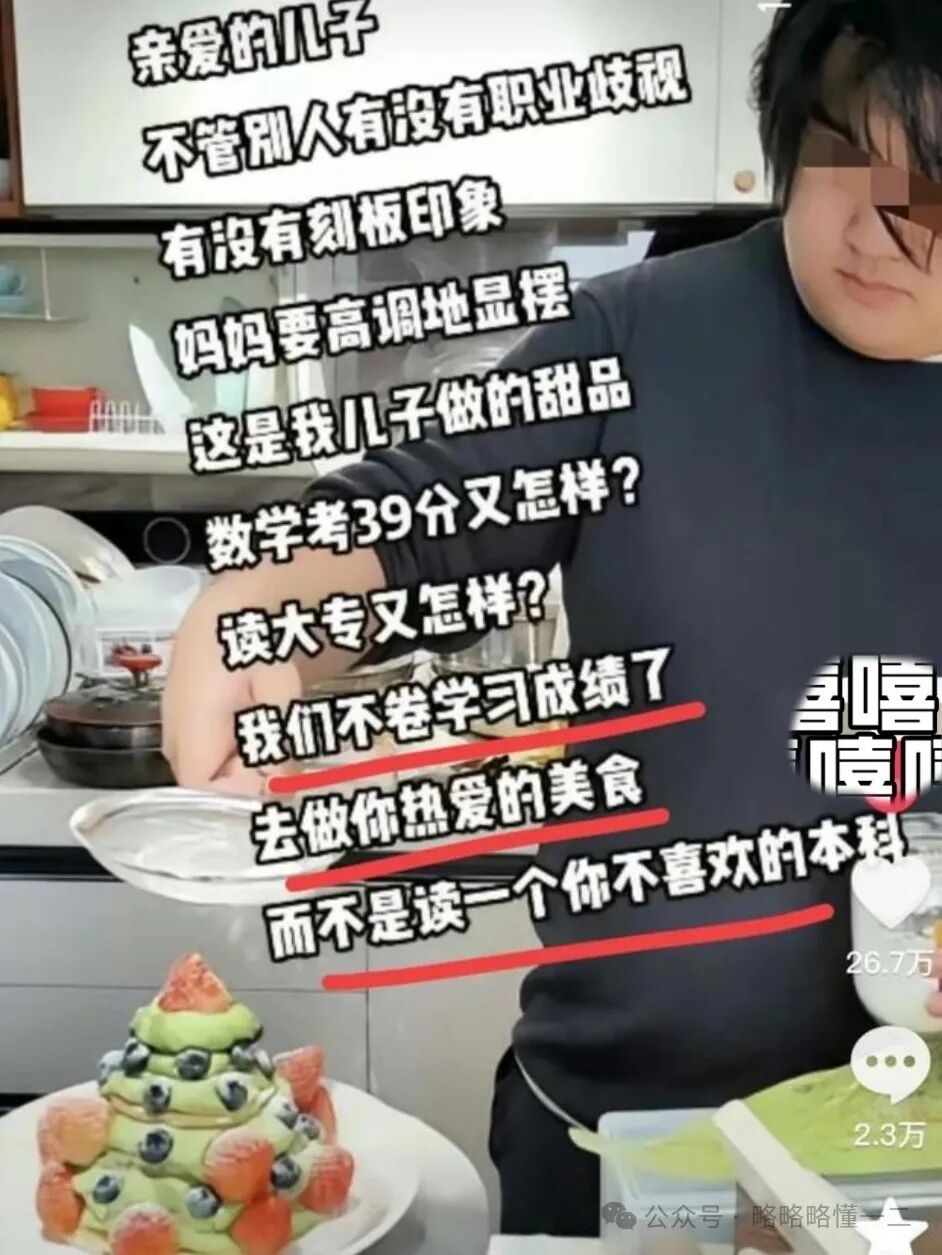 当然,也有一些三观比较正的家长,一位妈妈说不管别人有没有就业歧视,有没有刻板印象,妈妈都要高调地晒出儿子做的甜品,数学39分又怎么样?上大专又怎么样?