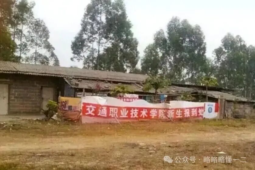 比如这所“交通职业技术学院”,“窘迫”到连一所教学楼都没有,新生报到处居然是老房子,似乎现在农村都找不到几家是这样的房子了,显得条幅格外显眼。