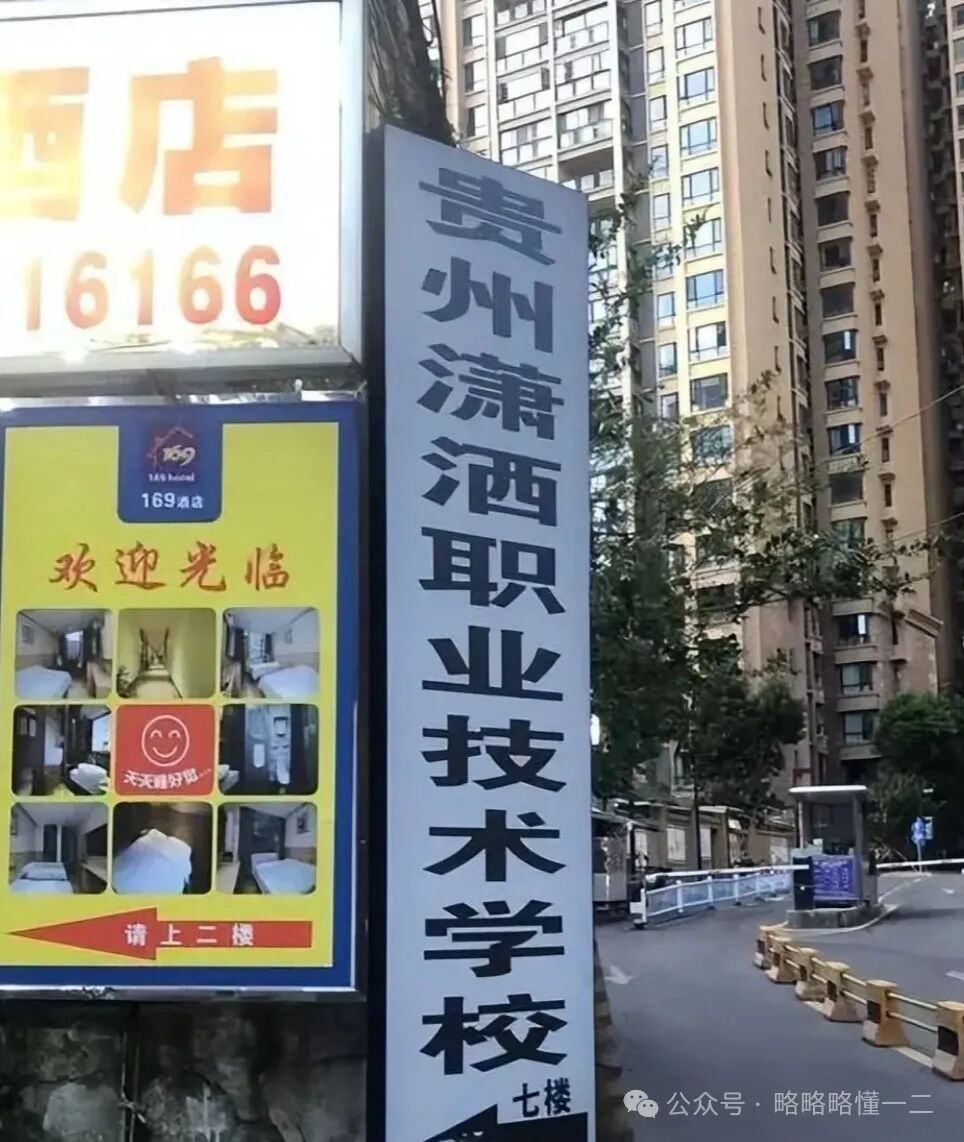 还有更离谱的,一所名叫“贵州潇洒职业技术学校”的学校走红,用白底黑字写的校名,看起来更加奇怪了,而且学校还在某酒店楼上的七楼,这到底是怎样的一所学校呢?