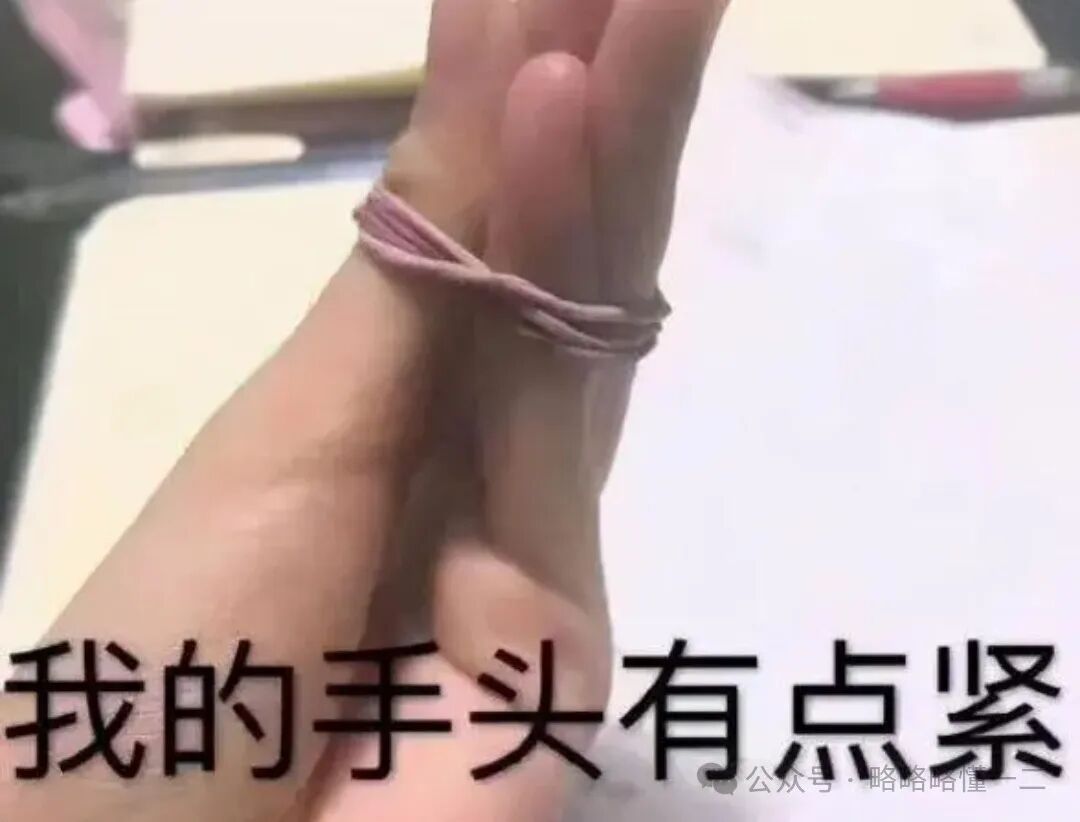 还有用橡皮筋勒手指头的,如果没有配文字的话,一般人可能都看不出来这是什么意思?不难猜是“手头有点紧”的意思。