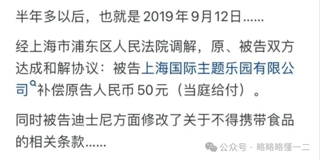 随后这名同学越想越生气,运用自己学习的知识将迪士尼告上法庭,经过法院的调节,原告和被告达成和解,被告上海国际主题乐园有限公司补偿原告50元人民币。