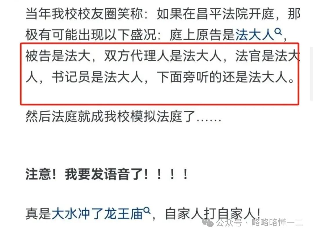 对于这件事情,当时校友圈还笑称说如果昌平法院开庭,极有可能出现这样的情况,原告是法大的人,被告是法大,双方代理人也是法大的人,同时法官、书记员,还有底下的听众也是法大的人。