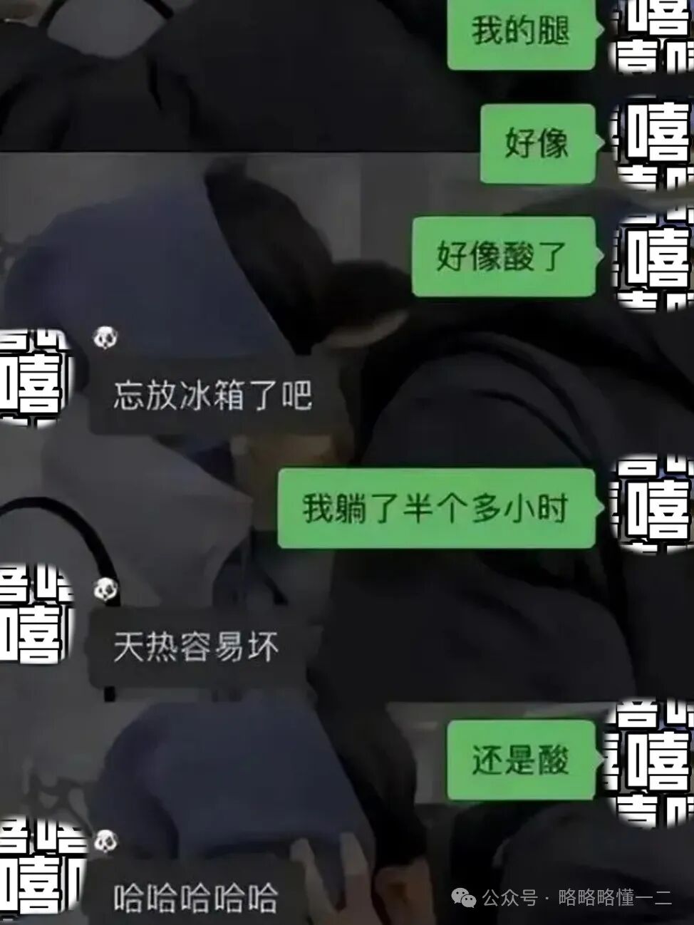 学弟说他的腿好像酸了,只不过这一句话分开说的,学姐也没细看,直接回复他:“忘放冰箱了吧!”果然什么东西怕坏怕酸放冰箱就对了。