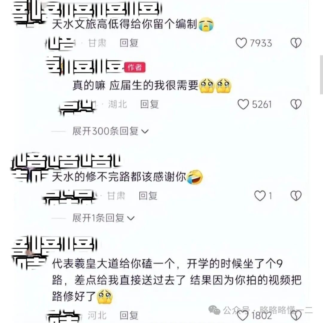 网友调侃说道:“天水文旅高低得给你留个编制”,很显然在这个节骨眼上,这句话得有多大的含金量,梁同学也积极回复了网友,她说自己是应届生,真的很需要。