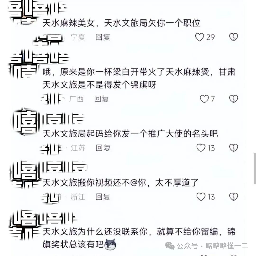 还有网友“指责”了天水文旅局,网友说文旅局搬运梁同学视频,还没@她出来,太不厚道了,就算是不能给一个编制,怎么也得送一个锦旗,让“梁白开”同学当一个推广大使。