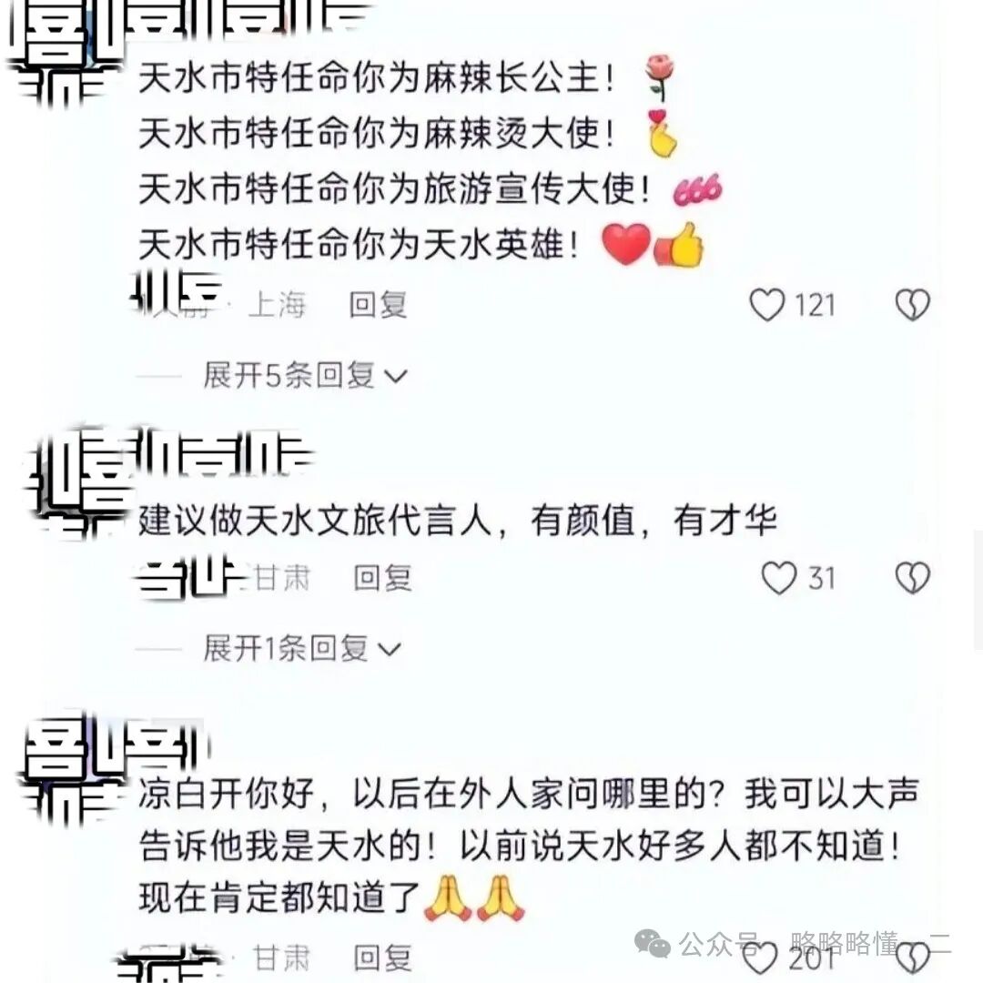 网友还给她赋予了新身份,天水市任命她为“麻辣长公主”、“麻辣烫大使”、“旅游宣传大使”、“天水英雄”,听起来既有特点又酷酷的。